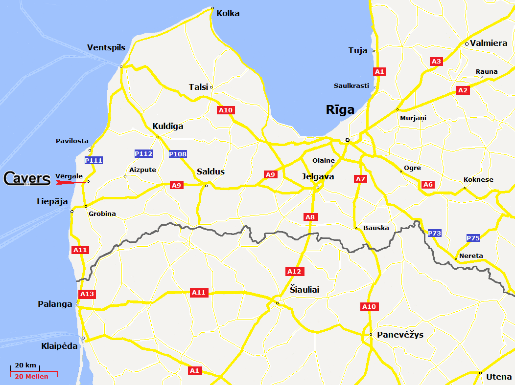 Vērgale im Kurland liegt 30 km nördlich von Liepāja (Libau). Liepāja ist per Fähre direkt mit Travemünde verbunden
